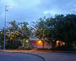 Palmerston library by night. The Palmerston markets can be seen in the foreground.
