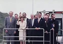 Support for the treaties came from a variety of interests, including the Joint Chiefs of Staff and members of Congress, such as Ernest Hollings, Hubert Humphrey,[14] and most importantly Howard Baker and Robert Byrd.[15] Carter's National Security Advisor Zbigniew Brzezinski attributed much of the political support for the treaty to his assuring attendees at a meeting including Byrd, that the United States would invoke the treaty to overthrow any Panamanian government that shut down the canal.[16] Other supporters included Admiral Elmo Zumwalt and General Maxwell Taylor;[17] John Wayne, who was friends with Omar Torrijos,[18] AFL-CIO president George Meany, statesmen Averell Harriman, Dean Rusk, George Ball, Henry Cabot Lodge, and John Sherman Cooper, and former first lady Lady Bird Johnson.[19] More moderate conservatives, including former President Gerald Ford and Henry Kissinger, both made public statements in support of the treaty.[20] Organized efforts to promote the treaties came from the Committee of Americans for the Canal Treaties and New Directions.[19]