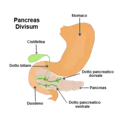 Pancreas divisum is a congenital anomaly in the anatomy of the ducts of the pancreas in which a single pancreatic duct is not formed, but rather remains as two distinct dorsal and ventral ducts. Most individuals with pancreas divisum remain without symptoms or complications. A minority of people with pancreatic divisum may develop episodes of abdominal pain, nausea or vomiting due to acute or chronic pancreatitis. The presence of pancreas divisum is usually identified with cross sectional diagnostic imaging, such as endoscopic retrograde cholangiopancreatography (ERCP) or magnetic resonance cholangiopancreatography (MRCP). In some cases, it may be detected intraoperatively.[1] If no symptoms or complications are present, then treatment is not necessary. However, if there is recurrent pancreatitis, then a sphincterotomy of the minor papilla may be indicated.