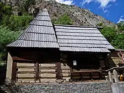 The present building of the Shiva temple, the only ancient remnant from Pandrethan to survive, was built sometime in the 8th–9th century CE.[11][12][13] The temple was originally part of a much larger complex. In 1665, the temple, then in a ruined state, was likely visited by François Bernier during his visit to the Kashmir Valley. During the 19th century, the temple was visited, sketched and photographed by several British and other European visitors, many of whom noted its exceptionally well-preserved stone ceiling.[14][15] Its smaller size and partially submerged condition may have prevented demolition by later Muslim rulers.[16][12] The temple's roof had likely sustained some damage from an earthquake in 1828, and possibly from two late 18th century earthquakes earlier.[17]