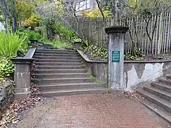 "One of Berkeley's romantic treasures, Orchard Lane is the formal pedestrian entrance to the Panoramic Hill residential neighborhood. The walk and Classical staircase, complete with pillars, balustrades, concrete benches, and an overhanging bower of trees, was built by Warren Cheney, who developed Panoramic Hill. In 1904 Cheney, the former editor of the literary magazine The Californian, purchased the land. In 1909 he commissioned Henry Atkins to design the stairway that still links residences with the University and town and other walkways that climb the hill."