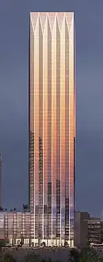 Paramount will possess a zigzag exterior similar to the nearby One22One Tower that reflects sunlight in multiple directions. The exterior will gradually converge into a "crown" (as described by Goettsch) made of five isosceles triangles pointing down.[9]
