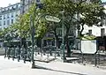 Three of the entrances took the form of free-standing pavilions or small stations,[5] including waiting rooms: one at Bastille and two on Avenue de Wagram at Étoile. These were in a style influenced by Japanese pagodas. At Étoile Guimard provided exterior doors for elevators, although the elevators were not built.[10] Eight simpler but still elaborate structures, labeled "Édicule B" by Guimard, were installed at the termini of Line 1 as originally opened and at two other major stations. These consisted of three-sided glass-roofed structures enclosing the stairway, with a projecting canopy.[10][11][12] A variation on this format, "Édicule A", lacked the canopy and was erected at two stations, Saint-Paul and Reuilly – Diderot.[10] These édicule types of entrance, which have come to be called libellules because they resemble dragonflies, in some cases had decorated wall panels surfaced in reconstituted lava.[11] The great majority of the entrances built (154) were unroofed enclosures, dubbed an entourage. A transitional form between the entourage and the édicule, railings with a roof and canopy, was used for one entrance at the Gare de Lyon métro station.[13]