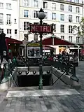 - Entourage Guimard: Square-Victoria-OACI station on the Montreal Metro in Canada has a genuine Guimard entrance made from parts of demolished Paris entrances (with map holder and "Métropolitain" sign and holder reproduced from the original molds). It was installed in 1967.[28] During restoration in 2001–2002, it was found to have the last examples of the original glass light globes, which in Paris had been replaced with plastic for safety; one was returned to the RATP and the other placed on display in the Montreal Museum of Fine Arts.[29]