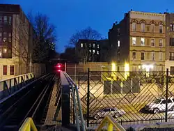 During 1905–1906, this portion of the line was rebuilt as a raised elevated railway and embankment structure,[3] and a new station was built at this location, with a single floor-level island platform and a station house between the tracks. The new station was located with the station house over Park Place and the platform extending north from that point.