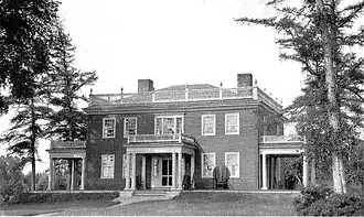 Parker House was constructed for Robert Parker and his wife Ruth, a daughter of Blue Hill founder Joseph Wood, in 1816 (or possibly in 1812), on an upland portion of the Parker family land grants of which Parker Point[2] was also part. After passing to other owners including Frederick Fisher, grandson of Blue Hill's first settled minister Jonathan Fisher, the house was remodeled in 1900 by George A. Clough for Mrs. Frederick Augustus Merrill, a resident of Boston descended from Ruth Parker's sister, Edith Wood Hinckley, the first child of early settlers to be born in Blue Hill.[3]