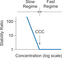 In the early stage of the aggregation process, the suspension mainly contains individual particles. The rate of this phenomenon is characterized by the aggregation rate coefficient k. Since doublet formation is a second order rate process, the units of this coefficients are m3s−1 since particle concentrations are expressed as particle number per unit volume (m−3). Since absolute aggregation rates are difficult to measure, one often refers to the dimensionless stability ratio W, defined as where kfast is the aggregation rate coefficient in the fast regime, and k the coefficient at the conditions of interest. The stability ratio is close to unity in the fast regime, increases in the slow regime, and becomes very large when the suspension is stable.