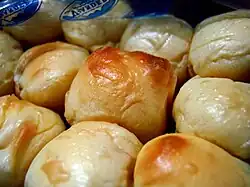 Pastel de Camiguín, (lit. 'Camiguin cake') or simply pastel, is a Filipino soft bun with yema (custard) filling originating from the province of Camiguin. The name is derived from Spanish pastel ("cake"). Pastel is an heirloom recipe originally conceived by Eleanor Popera Jose and the members of her family in Camiguin.[1][2] She started to commercially sell it on January 8, 1990 using the money left over from her husband's Christmas bonus. The name of the business was Vjandep Pastel meaning Virgilio Jose and Eleanor Popera (VJ and EP).[3] It is primarily produced at the time of family's special occasions and gatherings.