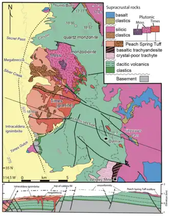 2. ^ a b c Ferguson, Charles A.; McIntosh, William C.; Miller, Calvin F. (2013). "Silver Creek Caldera- The Tectonically dismembered source of the Peach Spring Tuff". Geology. 41–1 (1): 3–6. Bibcode:2013Geo....41....3F. doi:10.1130/G33551.1.