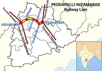 Peddapalli–Nizamabad line is a single-track broad-gauge railway line in the Indian state of Telangana. It connects Nizamabad and Peddapalli in South Central Railway zone.[1] It reduces the distance between Nizamabad, Karimnagar and Warangal. Peddapalli is located on Kazipet–Balharshah section of Delhi–Chennai line, known as Grand Trunk line and Nizamabad is located on Secunderabad–Manmad line. The line roughly follows National Highway 63 from Jagtial to Nizamabad.