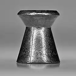 The diabolo pellet (or "wasp waist pellet") is the most common design traditionally found in airguns. It consists of a solid front portion called the head, which can have a flat ("wadcutter"), hemispherical ("round nose"), hollow point or conical ("pointed") front end profile, and a thin-walled funnel-shaped hollow rear portion called the skirt, joined by an hourglass-looking narrow mid-section known as the waist, giving the whole pellet the shape of a diabolo. The head is usually sized to just touch the rifling, and this keeps the pellet centered in the bore while keeping the friction as low as possible. The effect of friction is used in order to keep the pellet stationary until the piston has reached the end of its travel, compressing as much air as is possible. The thin hollow skirt is made of a malleable material, usually lead, although non-toxic alternatives are available that use tin or even plastic. During shooting, the skirt flares out and obturates the bore when pressure builds up behind it to provide a good seal that allows efficient pellet acceleration, and engages the rifling whereby imparting spin. In a smoothbore barrel, the skirt will still flare to provide a tight seal, but since there is no rifling the pellet will not spin, and is less accurate.