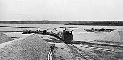 The line was opened in June 1901, being transferred to salt company Ferro y Piaggio, owned by Piaggio and the Ferro Brothers although Munno was also part of the society.[1] Apart from operating the rail line, Ferro y Piaggio was the concession of 15,000 hectare in Salinas Grandes, where the production reached 12,000 tons.[1] By 1902 the railway carried 2,300 tons of cargo but it still had no passenger services. Piaggio requested a concession for a railway from the ponds to an alternative port, over the edges of San José gulf. The concession was granted but works never started.[1]