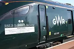 Great Western Railway named Class 802 unit 802008 RNLB Solomon Browne in a ceremony at Penzance TMD on 13 April 2019.[22]