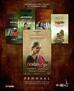 The Pennaal music series, consisting of five songs representing the major milestones of a woman's life, is considered the first of its kind in the Malayalam music industry.[21] Each stage is depicted through a thematic video that highlights either a traditional art form or a specific industry.