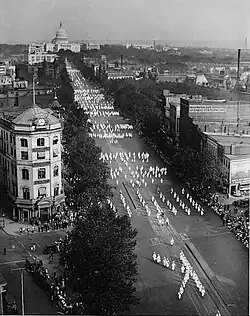 The area has also been the site of several important political protests and parades. A protest march of 400 unemployed workers led by the populist Jacob Coxey occurred on Pennsylvania Avenue on April 30, 1894.[156][157] The group became known as Coxey's Army, and this march was both the first significant popular protest march on Washington and also the first to receive national news coverage.[158] On March 3, 1913, Alice Paul led the National American Woman Suffrage Association (a women's rights organization and precursor to the League of Women Voters) in a parade up Pennsylvania Avenue in which they demanded the right to vote.[159] The association was the largest and most important organization in the fight for women's suffrage in the United States. The march was a critical event in the successful fight for the right to vote.[160] The women's rights march was strongly opposed by government officials, so when the association won the right to march it set a precedent under which almost any group could march on Pennsylvania Avenue.[160]