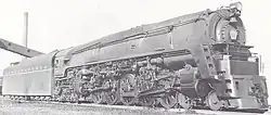 PRR's Board approved $595,000 (equal to $13,354,287 today) for the construction of this experimental Class dual service locomotive on Oct. 9, 1940. it was built in March 1942. Its streamlined shrouding, according to an interview of John W. Epstein, Special Projects Manager and vice president, Raymond Loewy & Assoc.,[2] was designed by Raymond Loewy, but,due to WWII, there was no publicity about it. The Q1 was a duplex locomotive; it had a wheel arrangement of 4-6-4-4, consisting of a four-wheel leading truck, two sets of driving wheels (six followed by four) in a rigid locomotive frame and a four-wheel trailing truck. The first group of six driving wheels was driven by a pair of cylinders mounted conventionally in front of them, while the rear four driving wheels were driven by cylinders mounted behind them on either side of the firebox.[3] As a locomotive designed for dual service like PRR M1s,[4] it was given larger-sized driving wheels at 77 in (1.956 m), which was as large as the Grand Trunk Western class U-4-b 4-8-4 "Northern" type.