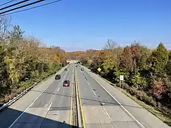 In the 1960s, the Pennsylvania Department of Highways planned for an expressway just east of the PA 100 corridor that would run from the Pennsylvania Turnpike interchange in Uwchlan Township to US 202 near West Chester, though these plans were never fully realized.[28] However, in 1968, a 2-mile (3.2 km) long, four-lane freeway was built connecting PA 100 south of Exton to US 202 north of West Chester. The freeway was officially unsigned, but was colloquially referred to as the "PA 100 Spur" and was designated as State Route 2023 (SR 2023) when the Location Referencing System was established in 1987.[29][30][24][31] In the 1970s, PA 100 was widened into a divided highway between Exton and Lionville.[32]