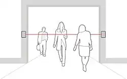 The simplest form of counter is a single, horizontal infrared beam across an entrance which is typically linked to a small LCD display unit at the side of the doorway. When the beam is broken a tick is 'recorded'. Since a person normally enters and leaves by the same door, dividing the 'ticks' by two gives a measure of visitor numbers. Beam counters usually require a receiver or a reflector mounted opposite the unit with a typical range from 2.5 metres (8 ft 2 in) to 6 metres (20 ft). Despite the limitations, infrared counters are still widely used due to their low cost and simplicity of installation.[26] The first generation of people counter had an expected accuracy level of 60% to 80%.