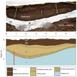 Labelled example of a massive buried ice deposit in Bylot Island, Canada[54]