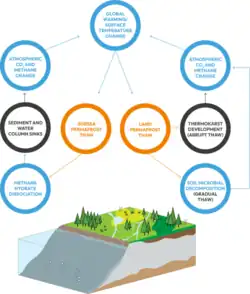 As recent warming deepens the active layer subject to permafrost thaw, this exposes formerly stored carbon to biogenic processes which facilitate its entrance into the atmosphere as carbon dioxide and methane.[11] Because carbon emissions from permafrost thaw contribute to the same warming which facilitates the thaw, it is a well-known example of a positive climate change feedback.[87] Permafrost thaw is sometimes included as one of the major tipping points in the climate system due to the exhibition of local thresholds and its effective irreversibility.[88] However, while there are self-perpetuating processes that apply on the local or regional scale, it is debated as to whether it meets the strict definition of a global tipping point as in aggregate permafrost thaw is gradual with warming.[89]