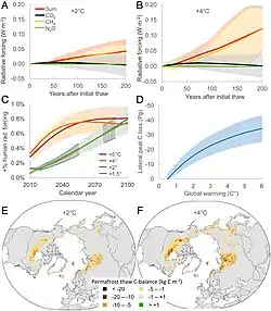 Fewer studies have attempted to describe the impact directly in terms of warming. A 2018 paper estimated that if global warming was limited to 2 °C (3.6 °F), gradual permafrost thaw would add around 0.09 °C (0.16 °F) to global temperatures by 2100,[100] while a 2022 review concluded that every 1 °C (1.8 °F) of global warming would cause 0.04 °C (0.072 °F) and 0.11 °C (0.20 °F) from abrupt thaw by the year 2100 and 2300. Around 4 °C (7.2 °F) of global warming, abrupt (around 50 years) and widespread collapse of permafrost areas could occur, resulting in an additional warming of 0.2–0.4 °C (0.36–0.72 °F).[88][101]