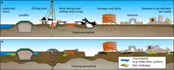 Apart from its climate impact, permafrost thaw brings more risks. Formerly frozen ground often contains enough ice that when it thaws, hydraulic saturation is suddenly exceeded, so the ground shifts substantially and may even collapse outright. Many buildings and other infrastructure were built on permafrost when it was frozen and stable, and so are vulnerable to collapse if it thaws.[12] Estimates suggest nearly 70% of such infrastructure is at risk by 2050, and that the associated costs could rise to tens of billions of dollars in the second half of the century.[13] Furthermore, between 13,000 and 20,000 sites contaminated with toxic waste are present in the permafrost,[14] as well as natural mercury deposits,[15] which are all liable to leak and pollute the environment as the warming progresses.[16] Lastly, concerns have been raised about the potential for pathogenic microorganisms surviving the thaw and contributing to future pandemics.[17][18] However, this is considered unlikely,[19][20] and a scientific review on the subject describes the risks as "generally low".[21]