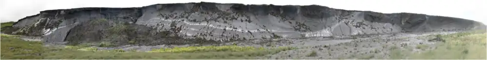 Cliff wall of a retrogressive thaw slump located on the southern coast of Herschel Island within an approximately 22-metre (72 ft) by 1,300-metre (4,300 ft) headwall.