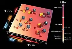 Nine probable scenarios of greenhouse gas emissions from permafrost thaw during the 21st century, which show a limited, moderate and intense CO2 and CH4 emission response to low, medium and high-emission Representative Concentration Pathways. The vertical bar uses emissions of selected large countries as a comparison: the right-hand side of the scale shows their cumulative emissions since the start of the Industrial Revolution, while the left-hand side shows each country's cumulative emissions for the rest of the 21st century if they remained unchanged from their 2019 levels.[11]