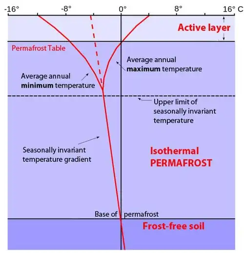 Permafrost temperature profile. Permafrost occupies the middle zone, with the active layer above it, while geothermal activity keeps the lowest layer above freezing. The vertical 0 °C or 32 °F line denotes the average annual temperature that is crucial for the upper and lower limit of the permafrost zone, while the red lines represent seasonal temperature changes and seasonal temperature extremes. Solid curved lines at the top show seasonal maximum and minimum temperatures in the active layer, while the red dotted-to-solid line depicts the average temperature profile with depth of soil in a permafrost region.