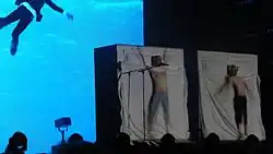 Pet Shop Boys were the first band to have a residency at a West End theatre, playing for two weeks at the Savoy Theatre in June 1997.[79] Lowe selected the song "Somewhere" from West Side Story to be the centrepiece of the performance and a new single.[80] The production featured an interactive film by Sam Taylor-Wood showing a party scene, which Tennant and Lowe appeared to leave and enter from the stage. The show lost money,[8] and the duo offset their losses in part by playing music festivals including the Roskilde Festival in 1997 and Creamfields in 1999.[81][82]
