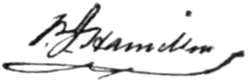 He married Rachel Burgett in 1891, and the couple traveled in Europe. They had a son (who died as a child) and two daughters. Active in Mobile society, Hamilton was a member of the Order of Myths as well as the Strikers Independent Society and the Mobile Rifle Company's drill team.