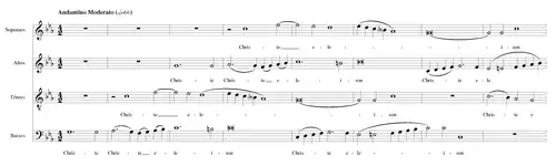 The work opens in A minor, with two chords marked pppp, extremely soft. The piano then begins an ostinato motif which remains present throughout the rest of the A sections of the movement.[22] A continuous flow of sixteenth notes appears in a pattern of the first sixteenth note in each beat played in octaves by the left hand (often including the third and fourth sixteenth notes, especially at the start), while the remaining sixteenth notes appear as chords in the right hand (often syncopated).[f] The harmonium introduces motifs repeated by the chorus. The voices pick up a slowly rising line on the word "Kyrie", marked sotto voce, in imitation: first tenor and bass, a measure later alto, a measure later soprano. The word "eleison" appears in contrasting homophonic chords marked forte, but smorzando to piano for the repeats of the word.[23] A second appellation begins in measure 18 in C major, marked pppp for "Kyrie" but with another sudden forte and decrescendo for "eleison".[24]