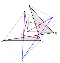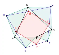 | Petr–Douglas–Neumann theorem as applied to a self-intersecting quadrilateral A0 = ABCD. A1 = EFGH is constructed using apex angle π/2 and A2 = PQRS with apex angle π. |