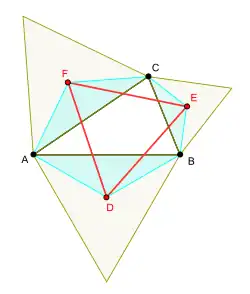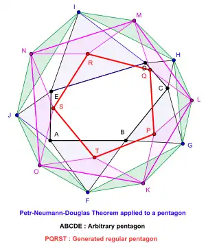 In geometry, the Petr–Douglas–Neumann theorem (or the PDN-theorem) is a result concerning arbitrary planar polygons. The theorem asserts that a certain procedure when applied to an arbitrary polygon always yields a regular polygon having the same number of sides as the initial polygon. The theorem was first published by Karel Petr (1868–1950) of Prague in 1905 (in Czech)[1] and in 1908 (in German).[2][3] It was independently rediscovered by Jesse Douglas (1897–1965) in 1940[4] and also by B H Neumann (1909–2002) in 1941.[3][5] The naming of the theorem as Petr–Douglas–Neumann theorem, or as the PDN-theorem for short, is due to Stephen B Gray.[3] It has also been called Douglas's theorem, the Douglas–Neumann theorem, the Napoleon–Douglas–Neumann theorem and Petr's theorem.[3]