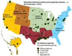 Petroleum refining in the United States in 2024 had a capacity of 18.4 million barrels per day.[2] Although the US was the world's largest net importer of refined petroleum products as recently as 2008, the US became a net exporter in 2010, and in 2014 was the largest exporter and the largest net exporter of refined petroleum.[3] As of January 2019, there were 135 operating refineries in the US, distributed among 30 states.[4]