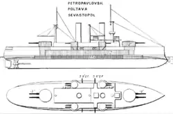 The Petropavlovsk-class ships carried four 15-inch (381 mm) torpedo tubes, all above water, mounted on the broadside and two broadside 18-inch (457 mm) underwater tubes. The forward 15-inch tubes were near the forward main gun turret and were unprotected by any armor; aft, the 15-inch tubes were protected by the upper armor belt. The underwater tubes were protected underneath the armor deck, forward of the forward 12-inch magazine. Each ship also carried 50 mines to be laid to protect its anchorage in remote areas.[8]