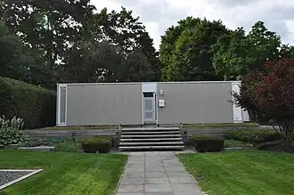 The Isaacson House stands in a residential area west of the Bates College campus and north of downtown Lewiston, on the west side of Benson Street. It is a single-story square structure with a flat roof, and is set further back from the street than neighboring houses. A central stone walkway approaches the house, which is set on a terraced rise accessed via floating stone steps. The exterior is finished in vertical siding, and features floor-to-ceiling windows with white trim. At the center of the front facade is a doorway-sized opening leading into a courtyard, which functions as a transitional space between the outside and inside. The main block of the house is divided into rooms three wide and three deep. Interior finish details include custom millwork and hardware.[2][3]