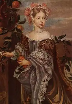 In 1653 Philipp Wilhelm married Elisabeth Amalie of Hesse-Darmstadt.[6] This second marriage lasted 37 years and was regarded as extremely happy. They had 17 children,[7] including the next two Palatine Electors, John William and Charles III Philip, as well as Elector-Archbishop Franz Ludwig von Pfalz-Neuburg. Many of these children have descendants today. In the early years of their marriage, the couple lived in Düsseldorf, where they founded churches and monasteries.