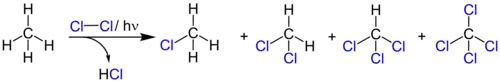 Subsequent products of photochlorination of methane (schematic representation without consideration of stoichiometry).