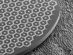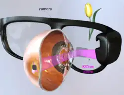 Photovoltaic retinal prosthesis is a technology for restoration of sight to patients blinded by degenerative retinal diseases, such as retinitis pigmentosa and age-related macular degeneration (AMD), when patients lose the 'image capturing' photoreceptors, but neurons in the 'image-processing' inner retinal layers are relatively well-preserved.[1] This subretinal prosthesis is designed to restore sight by electrically stimulating the surviving inner retinal neurons, primarily the bipolar cells. Photovoltaic retinal implants are completely wireless and powered by near-infrared illumination (880 nm) projected from the augmented-reality glasses. Lack of trans-scleral cable greatly simplifies the implantation procedure compared to other retinal implants.[2] Optical activation of the photovoltaic pixels allows scaling the implants to thousands of electrodes and retains natural coupling of the eye movements to visual perception. Studies in rats with retinal degeneration demonstrated that prosthetic vision with such subretinal implants preserves many features of natural vision, including flicker fusion at high frequencies (>20 Hz), adaptation to static images, antagonistic center-surround organization and non-linear summation of subunits in receptive fields, providing high spatial resolution.[3]