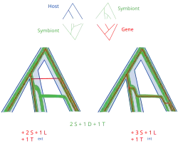 Reconciliation was then developed jointly for the coevolution of host and symbiont and the geographic diversification of species. In both settings, it was important to model a horizontal event that implied parallel branches of the host tree: host switch for host and symbiont and species dispersion from one area to another in biogeography. Unlike for genes and genomes, the coevolution of host and symbiont and the explanation of species diversification by geography are not always the null hypothesis. A visual depiction of the two phylogenies in a tanglegram can help assess such coevolution, although it has no statistical obvious interpretation.[17]