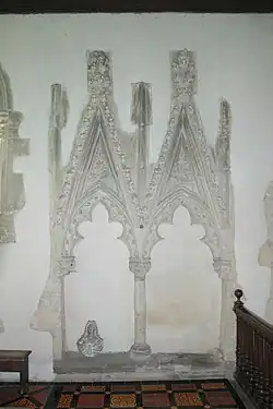 The chapel of Saint Nicholas in Piddington is known to have existed by 1309. It is now Piddington's Church of England parish church. Its Early English chancel was built in about 1300,[3] but has ornate Decorated Gothic sedilia and Easter Sepulchre carved in about 1350.[4] There is a canonical sundial on the south wall. In the 14th century the Decorated Gothic south aisle was added, with a four-bay arcade and some new two-light windows, but also re-using two Early English lancet windows presumably from the south wall of the nave.[3][4]