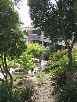 Much of the school is made of concrete with fake brick layers. Only a few buildings — such as the science and P.E. buildings — are completely indoors. The main building has open hallways. Most hallways and many classroom have views of the Bay.