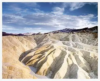 The Badwater Basin is a salt flat adjacent to the Black Mountains that descends to the lowest elevation in North America at 282 feet (86 m)[4] below sea level. The massive expanse of white is made up of almost pure table salt. The basin is the second lowest depression in the Western Hemisphere, eclipsed only by Laguna del Carbón in Argentina at −344 feet (−105 m).