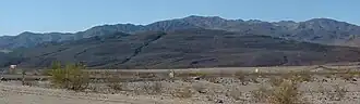 From this viewpoint, one can see the surrounding Panamint Range extending to the north and south; Death Valley to the east, with Furnace Creek and the salt flats of Badwater Basin to the southeast; and Mount Charleston in Nevada far to the east.[3]