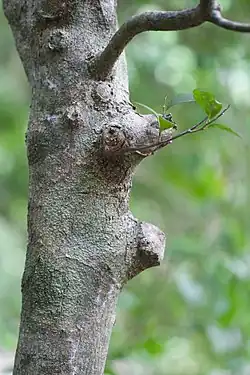 It is a small tree growing to 6 m, occasionally 10 m, in height, with a watery, white latex. The alternate, oval leaves are usually 40–80 mm long and 20–40 mm wide. The inconspicuous green flowers, 8 mm long, appear from May to July. The pointed, egg-shaped fruits are 13 mm long.[2]