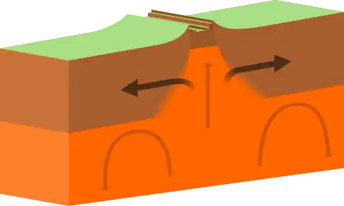 Tectonic plates are relatively rigid and float across the ductile asthenosphere beneath. Lateral density variations in the mantle result in convection currents, the slow creeping motion of Earth's solid mantle. At a seafloor spreading ridge, plates move away from the ridge, which is a topographic high, and the newly formed crust cools as it moves away, increasing its density and contributing to the motion. At a subduction zone, the relatively cold, dense oceanic crust sinks down into the mantle, forming the downward convecting limb of a mantle cell,[8] which is the strongest driver of plate motion.[9][10] The relative importance and interaction of other proposed factors such as active convection, upwelling inside the mantle, and tidal drag of the Moon is still the subject of debate.