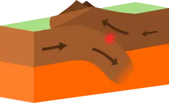 Earth's lithosphere, the rigid outer shell of the planet including the crust and upper mantle, is fractured into seven or eight major plates (depending on how they are defined) and many minor plates or "platelets". Where the plates meet, their relative motion determines the type of plate boundary (or fault): convergent, divergent, or transform. The relative movement of the plates typically ranges from zero to 10 cm annually.[7] Faults tend to be geologically active, experiencing earthquakes, volcanic activity, mountain-building, and oceanic trench formation.