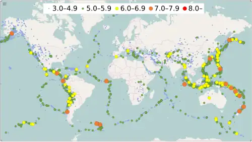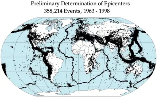 During the 20th century, improvements in and greater use of seismic instruments such as seismographs enabled scientists to learn that earthquakes tend to be concentrated in specific areas, most notably along the oceanic trenches and spreading ridges. By the late 1920s, seismologists were beginning to identify several prominent earthquake zones parallel to the trenches that typically were inclined 40–60° from the horizontal and extended several hundred kilometers into Earth. These zones later became known as Wadati–Benioff zones, or simply Benioff zones, in honor of the seismologists who first recognized them, Kiyoo Wadati of Japan and Hugo Benioff of the United States. The study of global seismicity greatly advanced in the 1960s with the establishment of the Worldwide Standardized Seismograph Network (WWSSN)[67] to monitor the compliance of the 1963 treaty banning above-ground testing of nuclear weapons. The much improved data from the WWSSN instruments allowed seismologists to map precisely the zones of earthquake concentration worldwide.