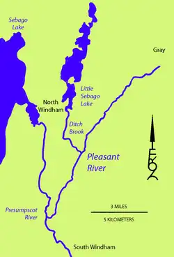 The Pleasant River originates in the town of Gray and parallels U.S. Route 202 as it flows southwesterly through the town of Windham to discharge into the Presumpscot River upstream of the village of South Windham. With the exception of a few cascades over exposed bedrock, the river has a fairly low gradient through the Presumpscot Formation of silt and clay marine mud with localized sandy lenses. Through the center of Windham, the river cuts through end moraines of glacial till, sand and gravel.[3]